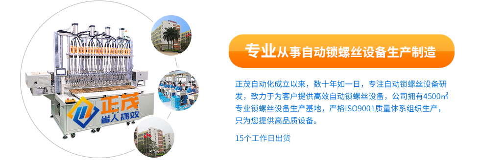 深圳市正茂自動(dòng)化設(shè)備有限公司位于深圳市寶安區(qū)。是專(zhuān)業(yè)自動(dòng)鎖螺絲設(shè)備設(shè)計(jì)、開(kāi)發(fā)、制造及銷(xiāo)售為一體的企業(yè),擁有多年從事自動(dòng)化擰螺絲設(shè)備開(kāi)發(fā)與生產(chǎn)的技術(shù)人才團(tuán)隊(duì)。致力于解決并實(shí)現(xiàn)高效率、高品質(zhì)、低成本、全自動(dòng)化生產(chǎn)作業(yè)。以提高客戶(hù)生產(chǎn)效率,降低生產(chǎn)成本為己任。以專(zhuān)業(yè)的設(shè)計(jì)理念和技術(shù)為您設(shè)計(jì)生產(chǎn)高性?xún)r(jià)比的自動(dòng)化生產(chǎn)設(shè)備。 主要設(shè)備有:手持式鎖螺絲機(jī)、多軸式鎖螺絲機(jī)、坐標(biāo)式自動(dòng)鎖螺絲機(jī)。 公司以人為本,以誠(chéng)為尊,為求不斷持續(xù)發(fā)展、精益求精,為客戶(hù)提供優(yōu)質(zhì)的產(chǎn)品和一流的服務(wù)是我們的責(zé)任,客戶(hù)的滿(mǎn)意是我們前進(jìn)的動(dòng)力。