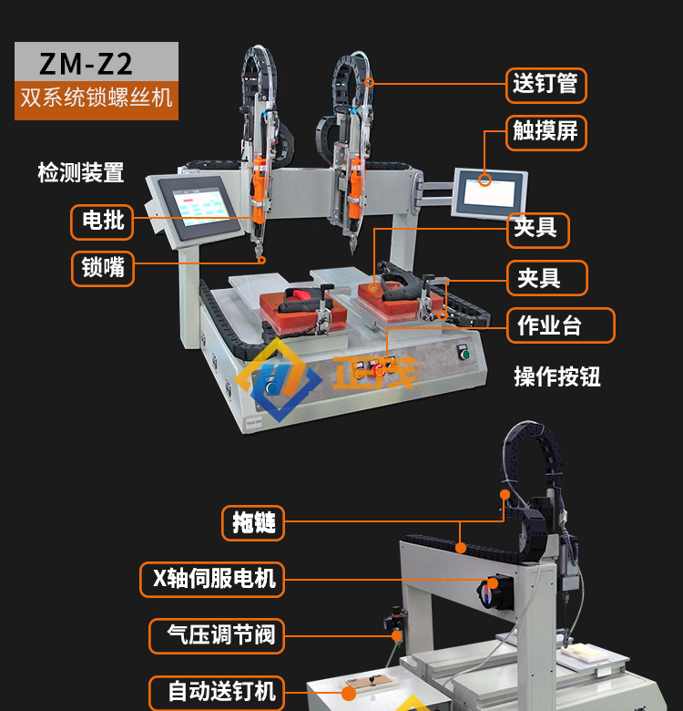 雙系統(tǒng)坐標式鎖螺絲機采用兩套獨立的送釘系統(tǒng)和鎖付系統(tǒng)同時作業(yè),也可分開作業(yè),可理解為兩臺單平臺坐標式鎖螺絲機。