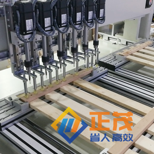 該案例木板生產(chǎn)效率高,先鉆好每排6顆螺絲,再同時擰好每排的6顆螺絲,生產(chǎn)標(biāo)準(zhǔn)高,6軸的位置根據(jù)螺絲孔的位置來精確固定,扭力根據(jù)要求設(shè)置好,不會出現(xiàn)擰歪、滑牙、擰壞螺絲的現(xiàn)象。操作簡單,員工只需要將木板放置在治具上即可。根據(jù)設(shè)定好的位置自動鉆孔并自動擰好螺絲。操作簡單,通用性好,正茂多軸自動擰螺絲機根據(jù)產(chǎn)品要求設(shè)計,可滿足多種不同型號擰螺絲要求。