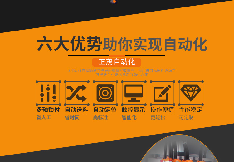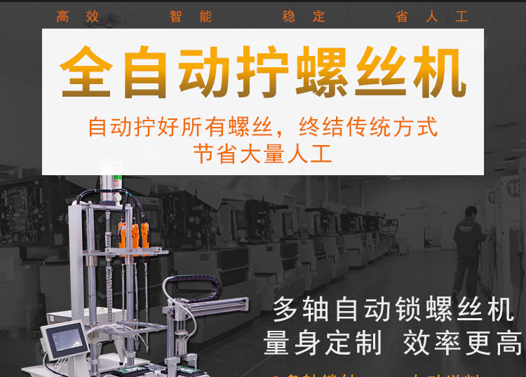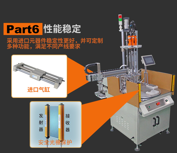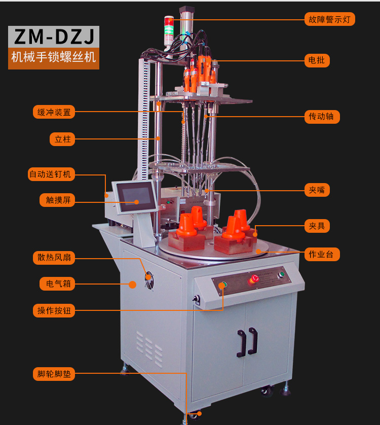 多軸帶機械手鎖螺絲機是在多軸式自動鎖螺絲機上配置圓形作業(yè)臺和機械手臂,可實現(xiàn)產(chǎn)品螺絲自動輸送、擰緊、取放工件等,通常配合流水線作業(yè),放置在流水線旁即可,節(jié)省大量人工。
